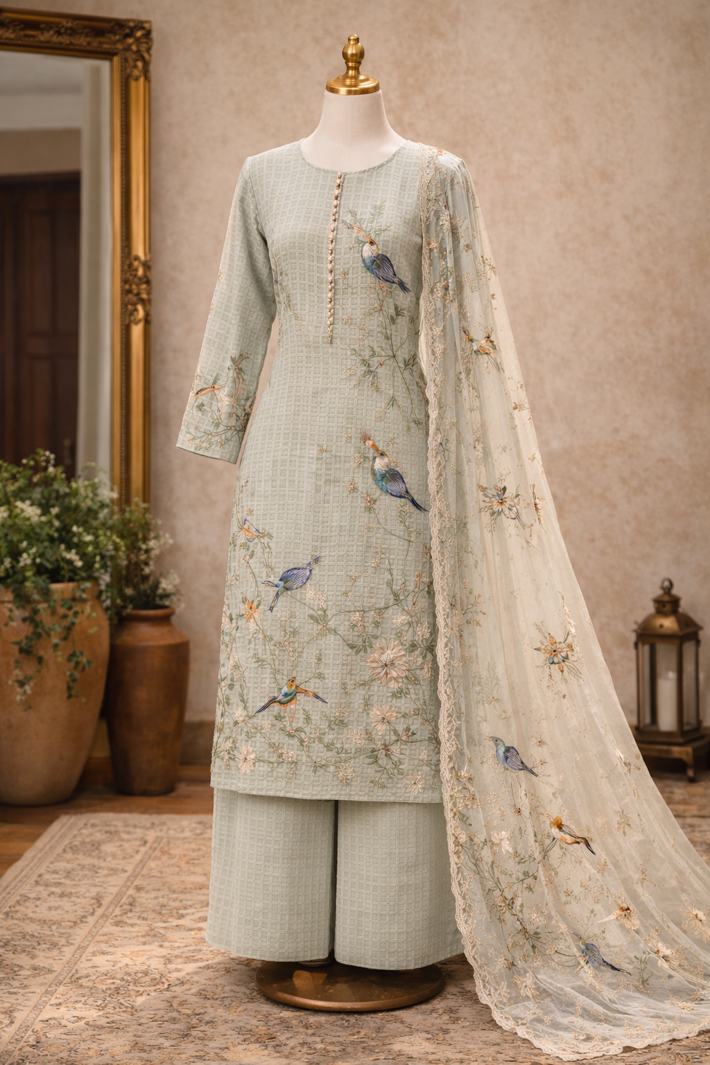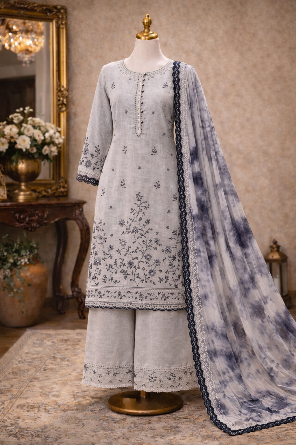 Deep ink-blue Gawadin Silk kameez paired with a matching wide palazzo for a smooth, flowing look.Finished…